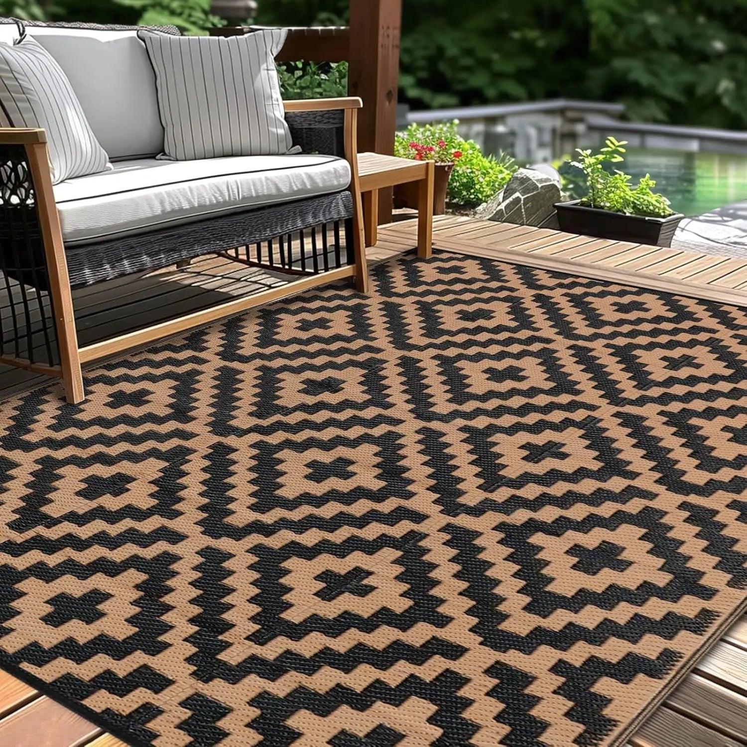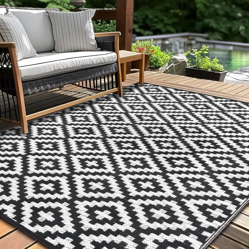 - 𝐌𝐮𝐥𝐭𝐢𝐩𝐮𝐫𝐩𝐨𝐬𝐞 𝐎𝐮𝐭𝐝𝐨𝐨𝐫 𝐃𝐞𝐬𝐢𝐠𝐧: This reversible outdoor rug effortlessly transitions between patios, balconies, poolside areas, and indoor entryways, providing instant style upgrades for summer gatherings, autumn events, or year-round decorative use with its dual-pattern versatility