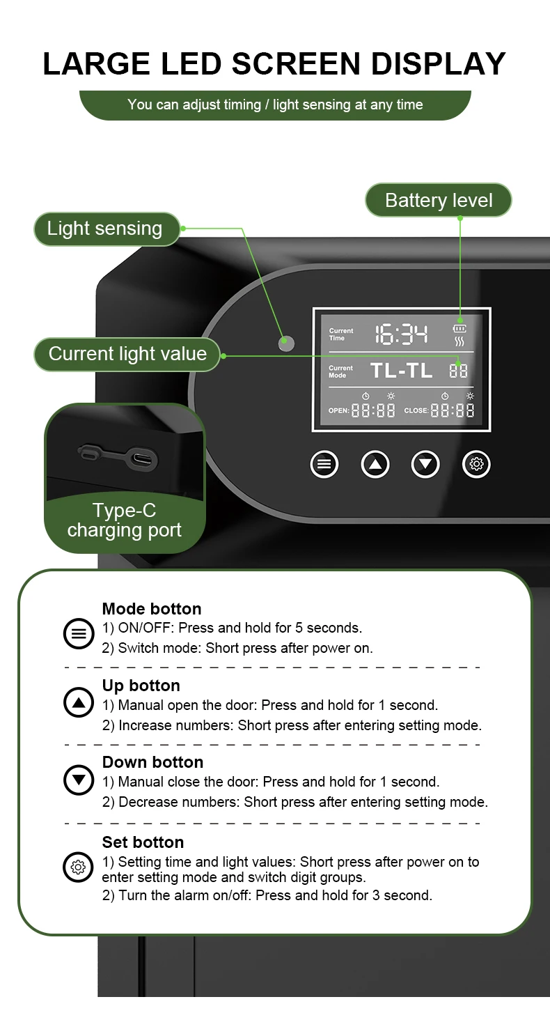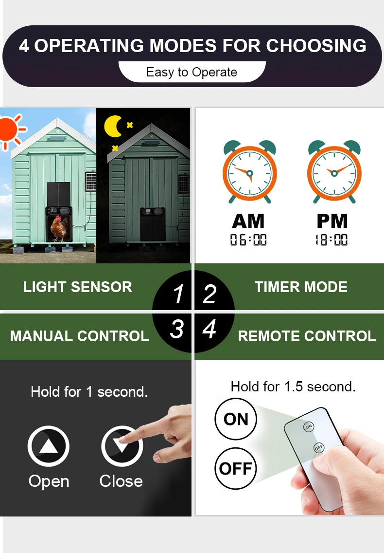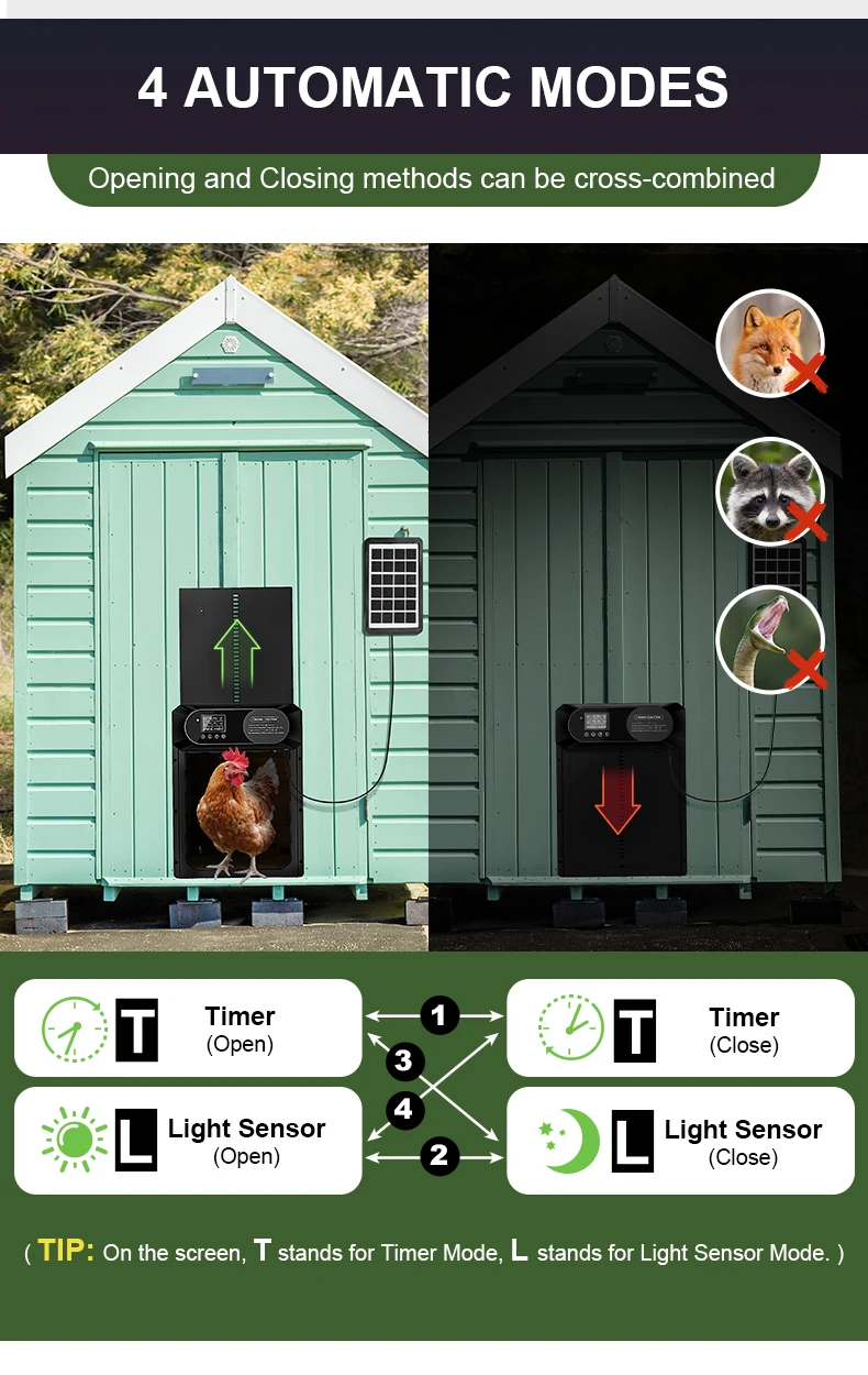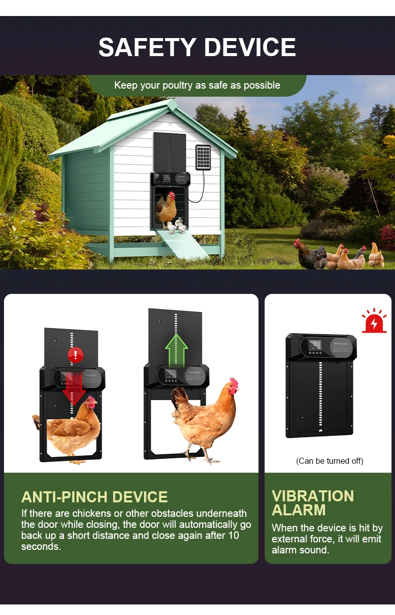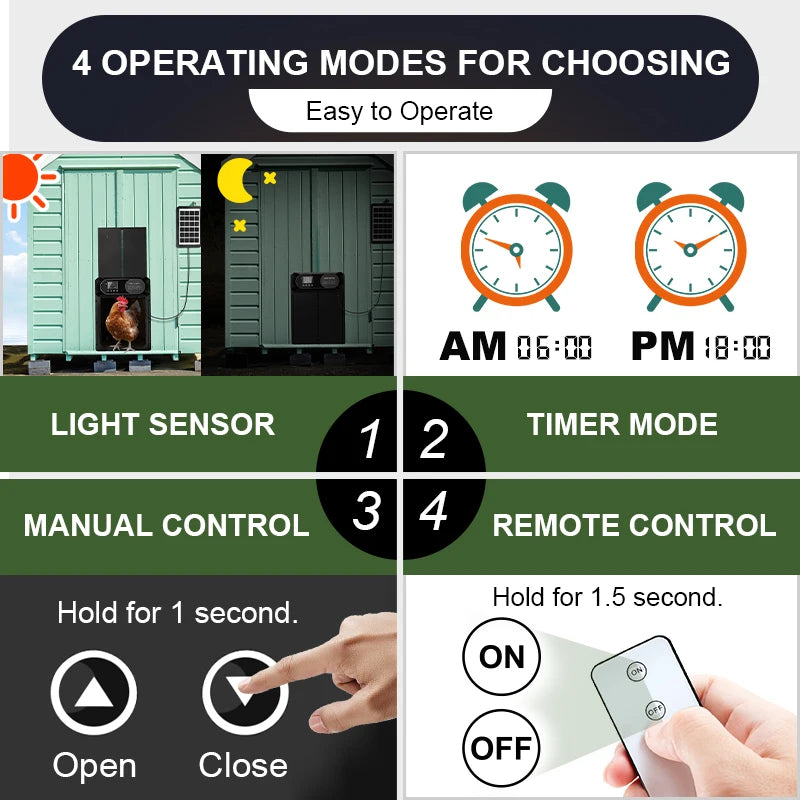 Fully automatic solar powered chicken coop door with remote control, timer, light sensor, chicken coop door, suitable for farms
