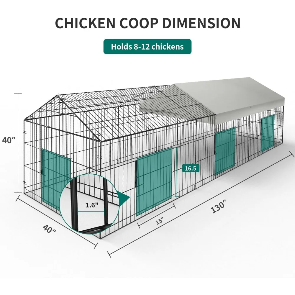 - 【Comfortable Activity Space】 The 130" L x 40" W x 40"H large chicken coop provides a safer and more spacious space for the poultry, this coop is big enough for 8-12 chicks, and can also house rabbits, ducks and geese.