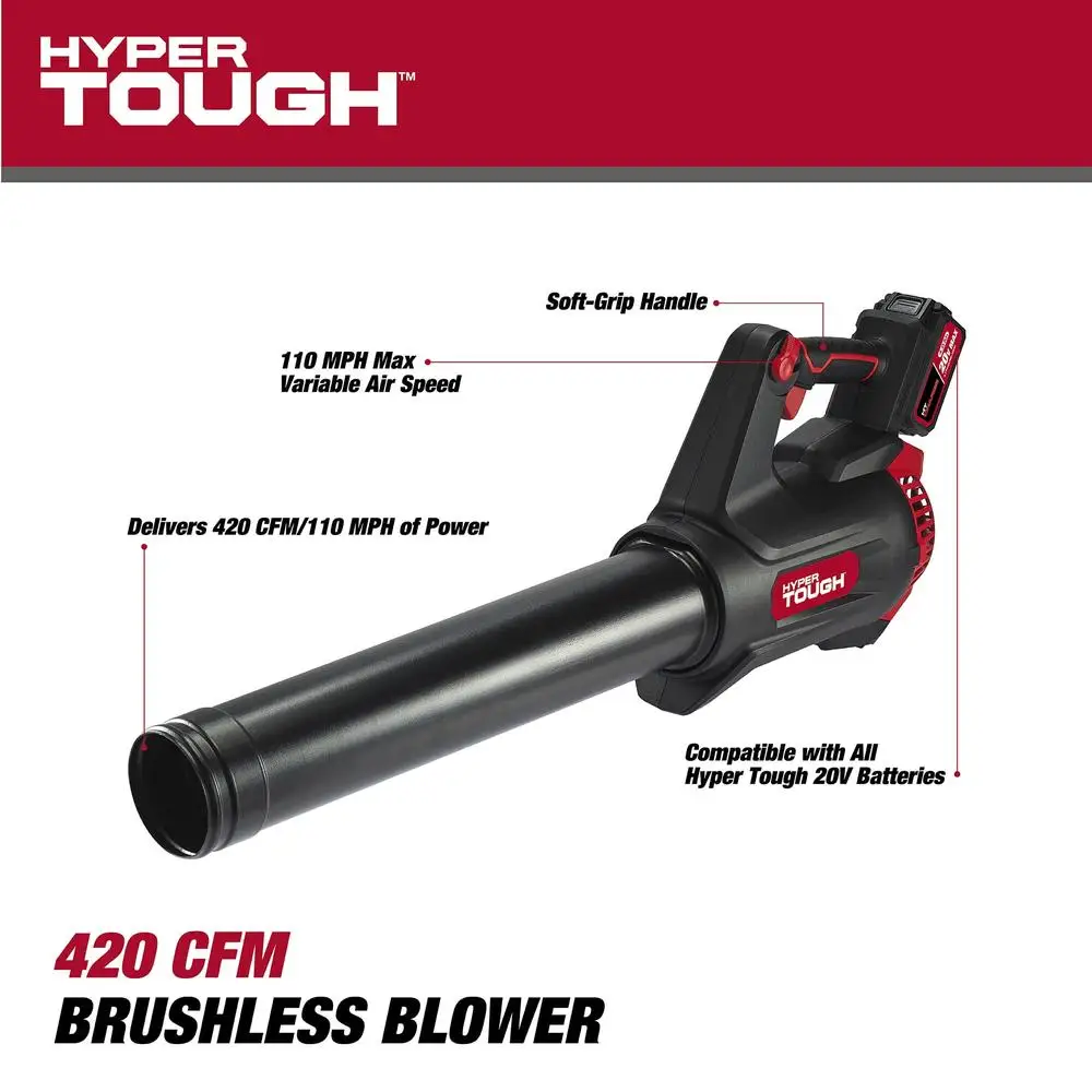 The Hyper Tough 20V MAX Cordless 420 CFM Brushless Blower features 420 CFM air volume and 65-110 MPH Air speed. The variable speed cruise control allows you to go from clearing your driveways and walkways of dirt and debris, to keeping decks and porches free from dust, leaves and pine needles. The brushless motor is reliable and able to deliver more strength, as well as a longer run-time than other leaf blowers. The Hyper Tough 20V MAX Cordless 420 CFM Brushless Blower also comes with a 20V Max 4. 0 Ah lithium-ion battery and a 20V Max battery charger, providing long-lasting power to get the job done. When you are ready to make repairs or tackle home-improvement projects, Hyper Tough is ready.