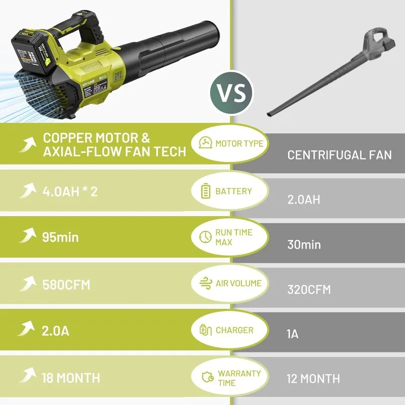 - 🍂【Upgraded Powerful Copper Motor & Axial-Flow Fan Tech-Sym leaf blower cordless has an upgraded copper motor which provides a longer lifespan and lower energy consumption than ordinary motors. It adopts axial flow fan technology with faster rotation speed, wind speed and better heat dissipation than traditional centrifugal fans.