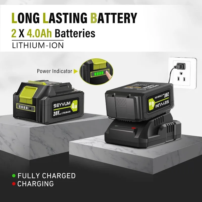 - 🍂【Two 4.0Ah Large-Capacity Batteries The electric leaf blower is equipped with two 4.0Ah x 20V batteries and a 2A fast charger. Each battery can be fully charged in only 2 hours. Total operating time for two batteries lasts approximately 35 mins (high speed) and approximately 95 mins (low speed). You can monitor the remaining power and charging progress through the power indicator.