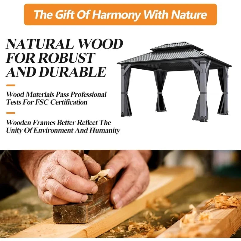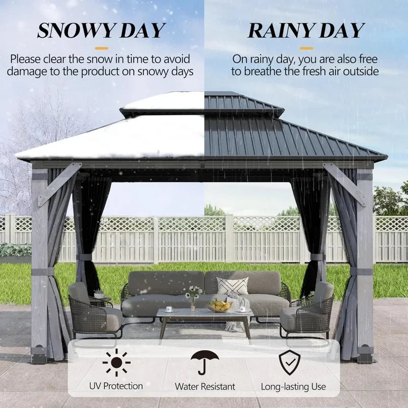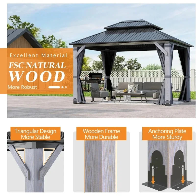 10' x 12' Outdoor Gazebo, Hardtop Pavilion with Double Curtains, Galvanized Steel Roof, Cedar Wood Structure