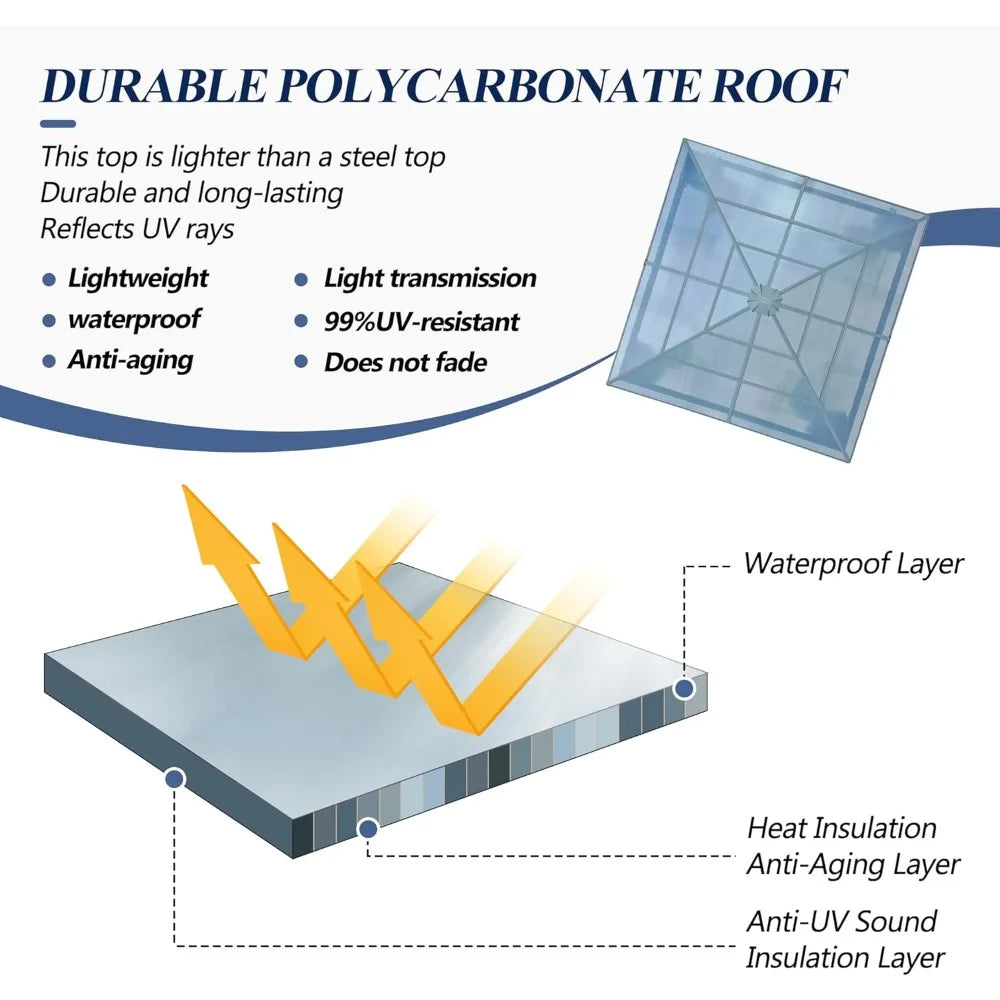 ️PERMANNET POLYCARBONATE ROOF: The Gazebo adopts a polycarbonate roof design which can filter out 99% UV rays and help keep the gazebo cooler. The reasonable roof slope design also allows water to flow out fast to prevent rainwater from massing. The polycarbonate gazebo adopts a translucent roof design. You can see the sky through this translucent roof and enjoy the starry sky in summer at night and the snowy scenery in winter