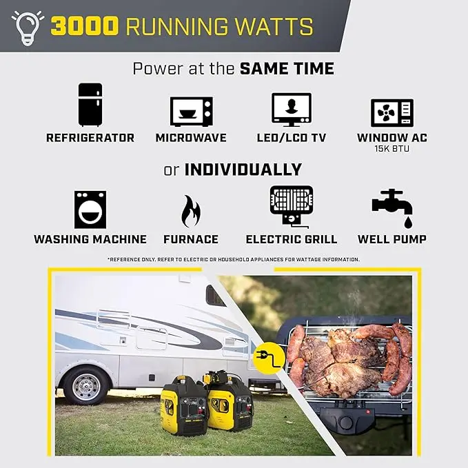 - 64 dBA from 23 feet is perfect for camping, tailgating or to backup a few home essentials, with 4000 starting watts, 3000 running watts and up to 10 hours run time, plus features CO Shield carbon monoxide auto shutoff system