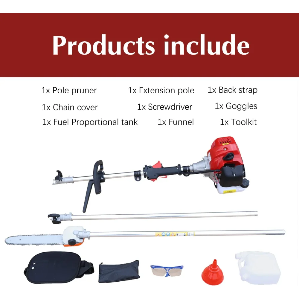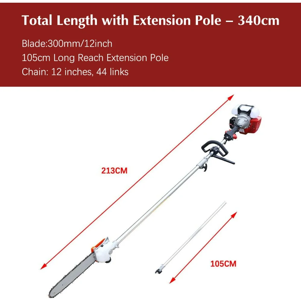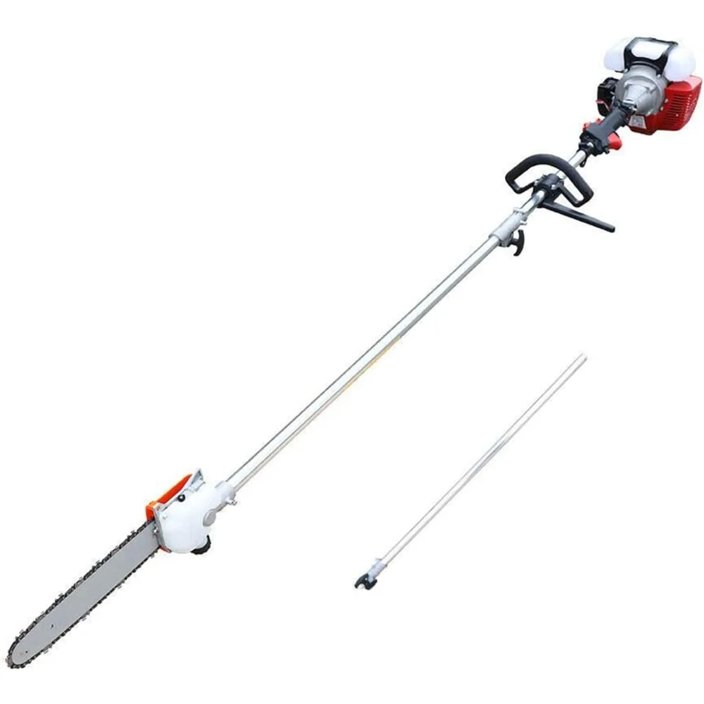 【DURABLE】Our garden tools offers a solution for every occasion, their rugged and sturdy design stands out amongst the crowd and allows even the toughest of tasks to be completed with ease. 【POWERFUL ENGINE】: 42.7cc,1250w, 2-stroke engine which is more powerful and steady. It can cut branches effortless, gas chainsaw also help you save time and energy. It can trim 7-8 inch branches effectively 【ADJUSTABLE EXTRA LENGTH】Our long pole chainsaw can be easily extended to 7.87-11.5 feet with an extension bar. The sawing length is 11 feet. If you are 6 feet tall, then you can safely extend the pole saw up to 16 feet high with just your feet firmly planted on the ground! 【PORTABLE BAG】: We specially provide a portable bag! You can carry and store the saw easily. And it comes with a shoulder strap, which can help reduce vibration and fatigue. It makes the chainsaw easy to use 【EFFORTLESS START】: engine passed the EPA certificated, which is safer and more stable. And it also makes pull starts easier.You can start the saw with 3-4 times pullWe will response within 24 hours