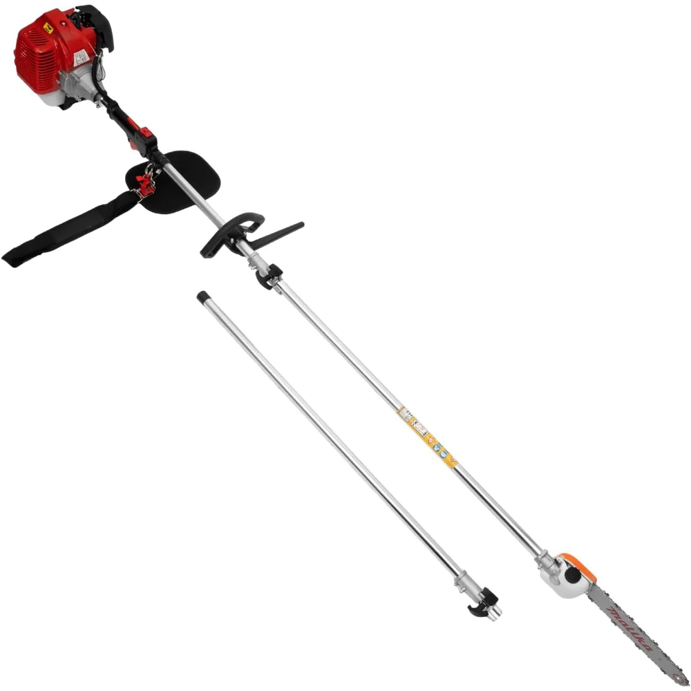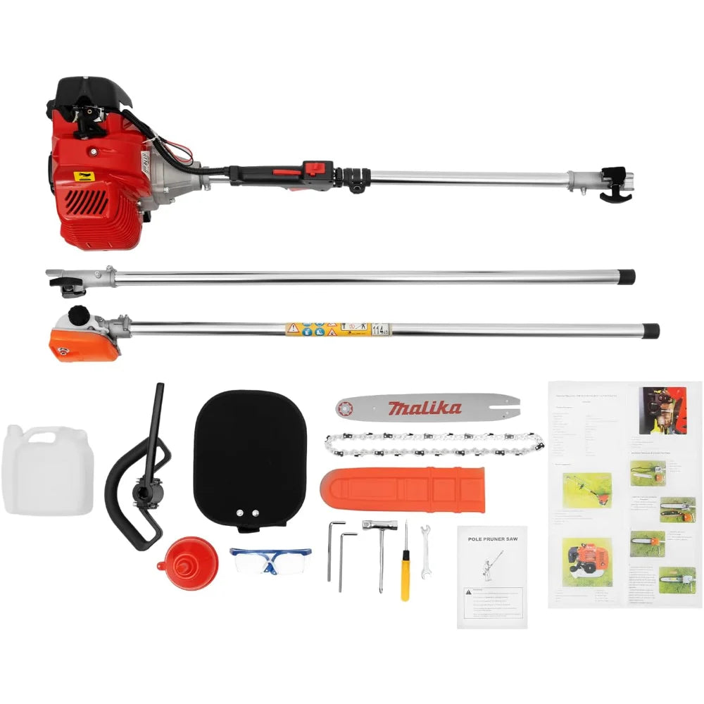 Split Shaft System -- This is the latest design incorporating a tough and Powerful with lightweight split shaft system to quickly change attachments depending on the task in hand. The high power efficient 42.7cc 2 stroke petrol engine gets you straight to work with the minimum of fuss - simply fuel up - and away you go Convenient Design -- New Model with Split Shaft allowing you to quickly swap attachments to suit the task in hand. Our garden tools offers a solution for every occasion, their rugged and sturdy design stands out amongst the crowd and allows even the toughest of tasks to be completed with ease Ergonomic Design - It's ergonomic front handle and twin padded shoulder harness allows the greatest of movement with the least amount of effort allowing you work on a greater area more quickly Specifications -- Power Unit:42.7CC 2 Stroke Petrol Engine Unit; 1L Fuel Tank; Recoil Quick Starter; Automatic Clutch; 25:1 Fuel Mix; Long Reach Pole Pruner / Chainsaw; Blade - 300mm/12''; Total Length with Extension Pole - 340cm ;105cm Long Reach Extension Pole Package -- 1x Pole pruner; 1x extension pole; 1x back Strap; 1x Chain cover; 1x Screwdriver; 1x glassess; 1x fuel Proportional tank; 1x funnel; 1x Toolkit