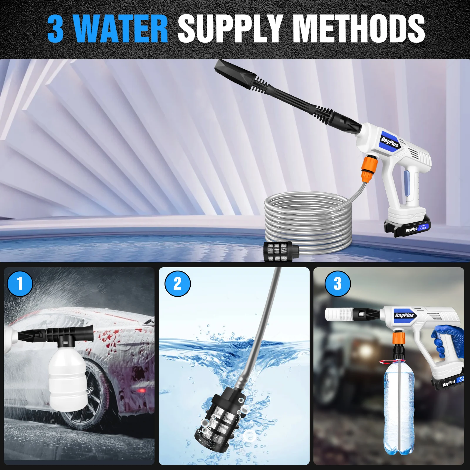Two Sucking Ways: This portable power washer comes with a 16.4ft hose, not only sucks water from a faucet, but also from a source such as a lake, or a bucket, which makes it also usable where there is no running water, making it the perfect pressure washer for outdoor camping and long trips.