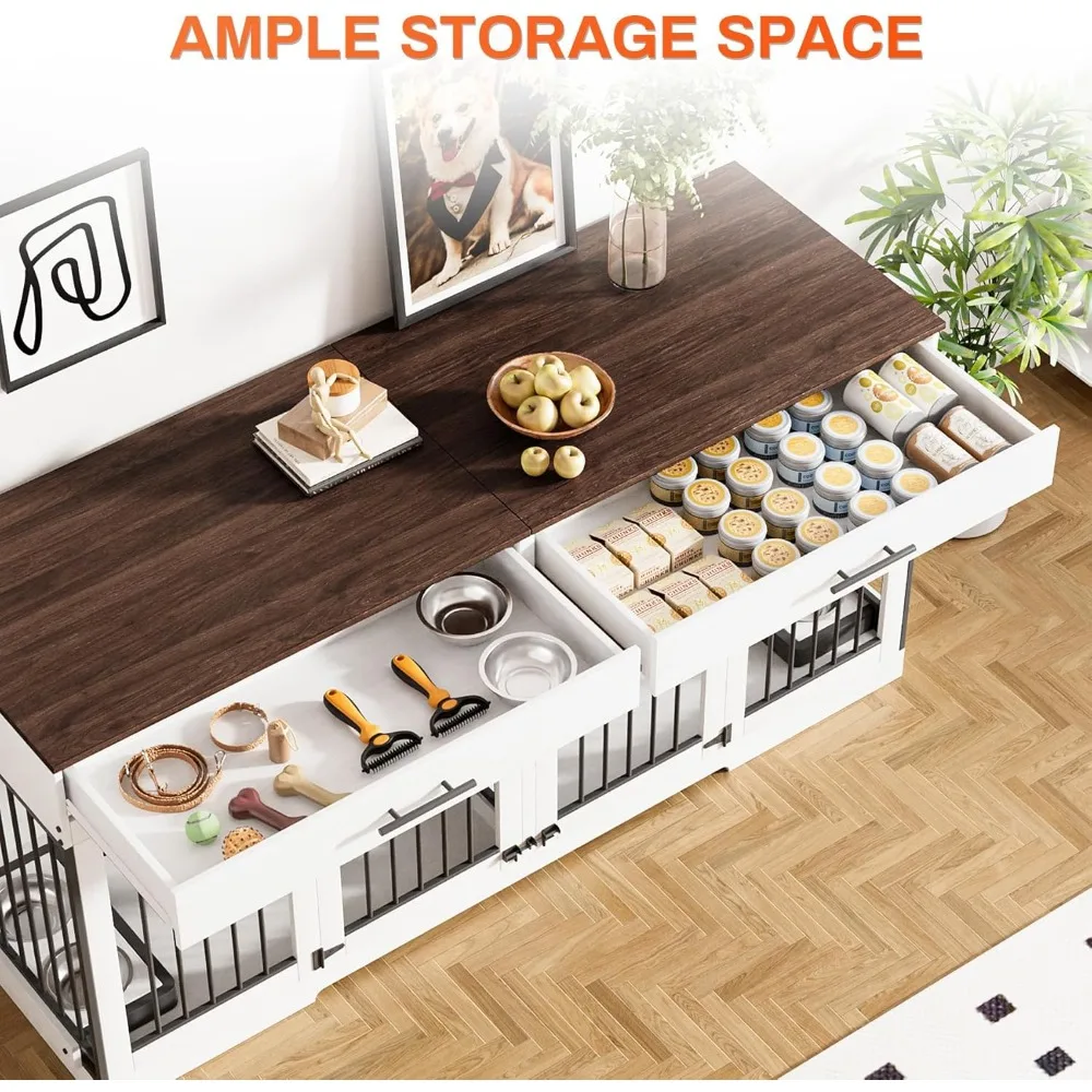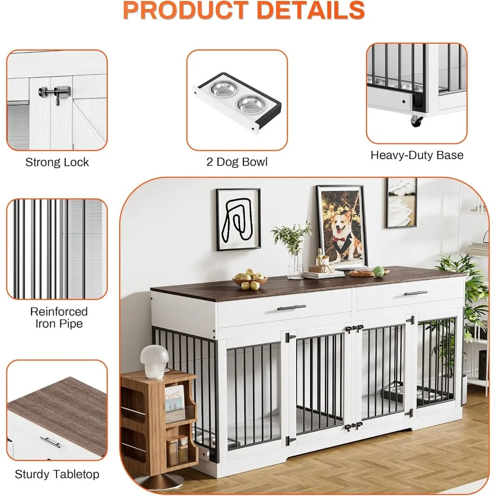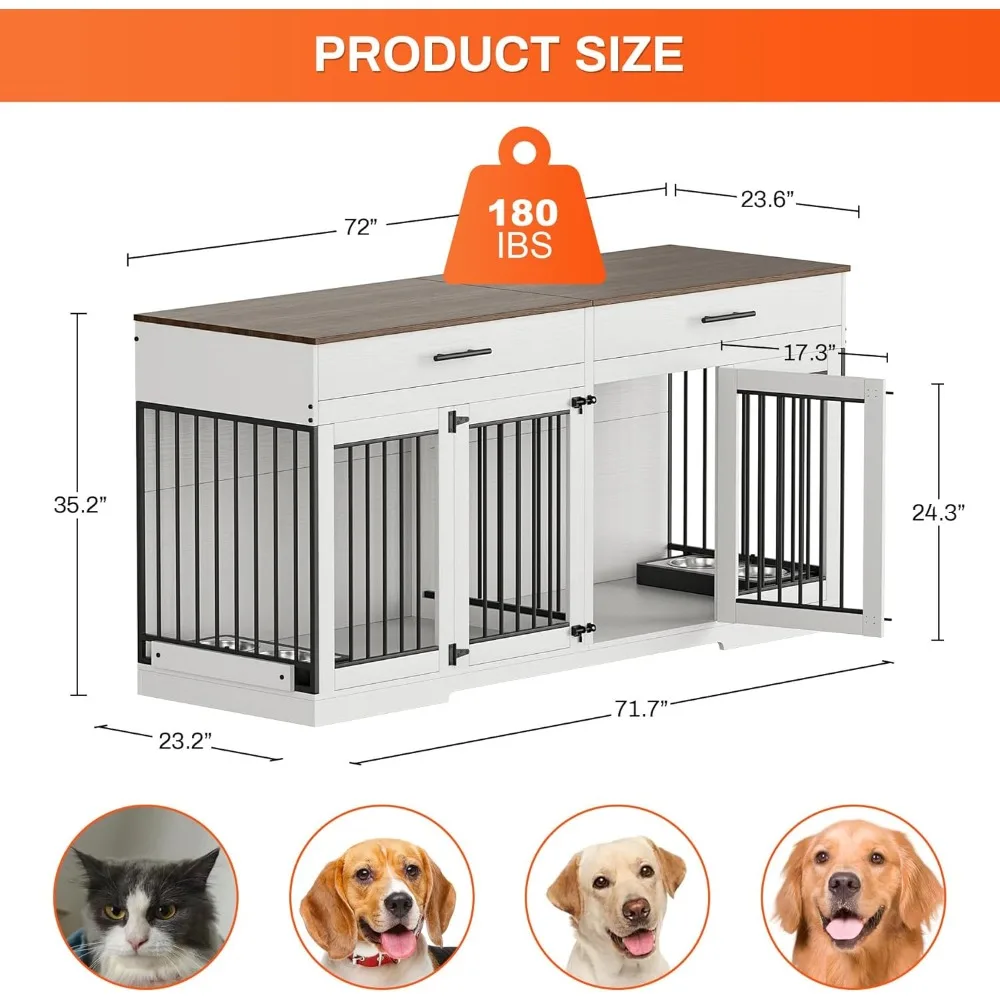 USA FREE SHIPPING!!! 72" Dog Crate Furniture for 2 Dogs, Large Dog Kennel Furniture with 2 Storage Drawer and Removable Divider, Wooden Dog