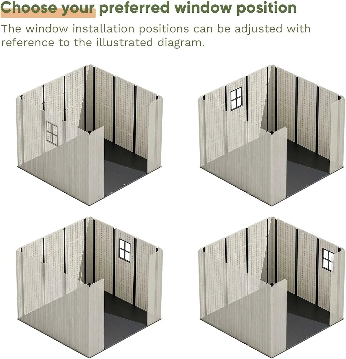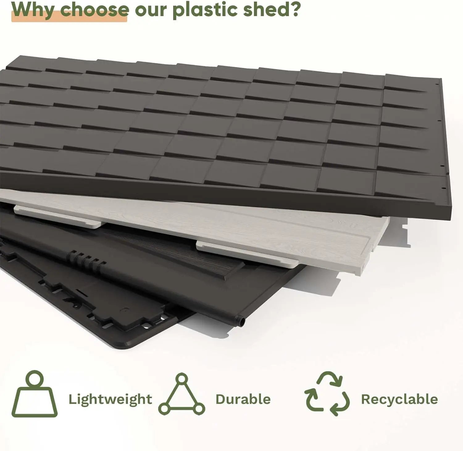 8'x8' plastic shed is a sturdy and durable storage solution for your outdoor space. Made from durable plastic material, it is designed to withstand the elements and provide long-lasting protection for your belongings. The shed features a spacious interior with ample room for storing gardening tools, lawn equipment, bicycles, and more. It has two large, lockable doors that open wide for easy access and ventilation. Our plastic shed design is a game-changer. It's simple and time-saving. It drastically reduces the number of screws needed by 35%, making assembly quicker and easier with minimal tools required. Its neutral color and stylish design make it a great addition to any backyard or garden area.