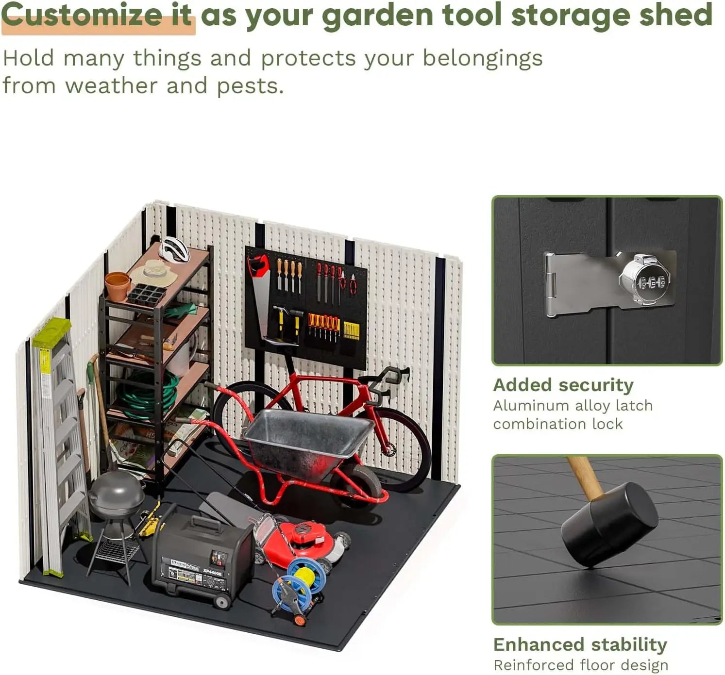 8'x8' plastic shed is a sturdy and durable storage solution for your outdoor space. Made from durable plastic material, it is designed to withstand the elements and provide long-lasting protection for your belongings. The shed features a spacious interior with ample room for storing gardening tools, lawn equipment, bicycles, and more. It has two large, lockable doors that open wide for easy access and ventilation. Our plastic shed design is a game-changer. It's simple and time-saving. It drastically reduces the number of screws needed by 35%, making assembly quicker and easier with minimal tools required. Its neutral color and stylish design make it a great addition to any backyard or garden area.