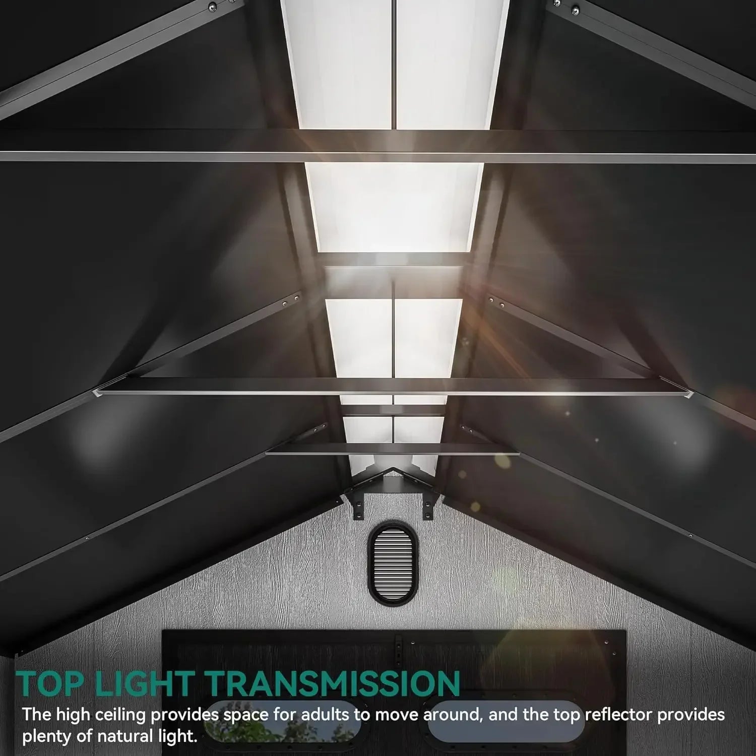 - Air-Ventilated and Light-Transmissible: The lockable door design offers anti-theft protection; Skylights and semi-transparent side windows facilitate natural light while louvered windows promote air circulation to prevent moisture build-up; A sloped roof effectively drains water to achieve extended durability
