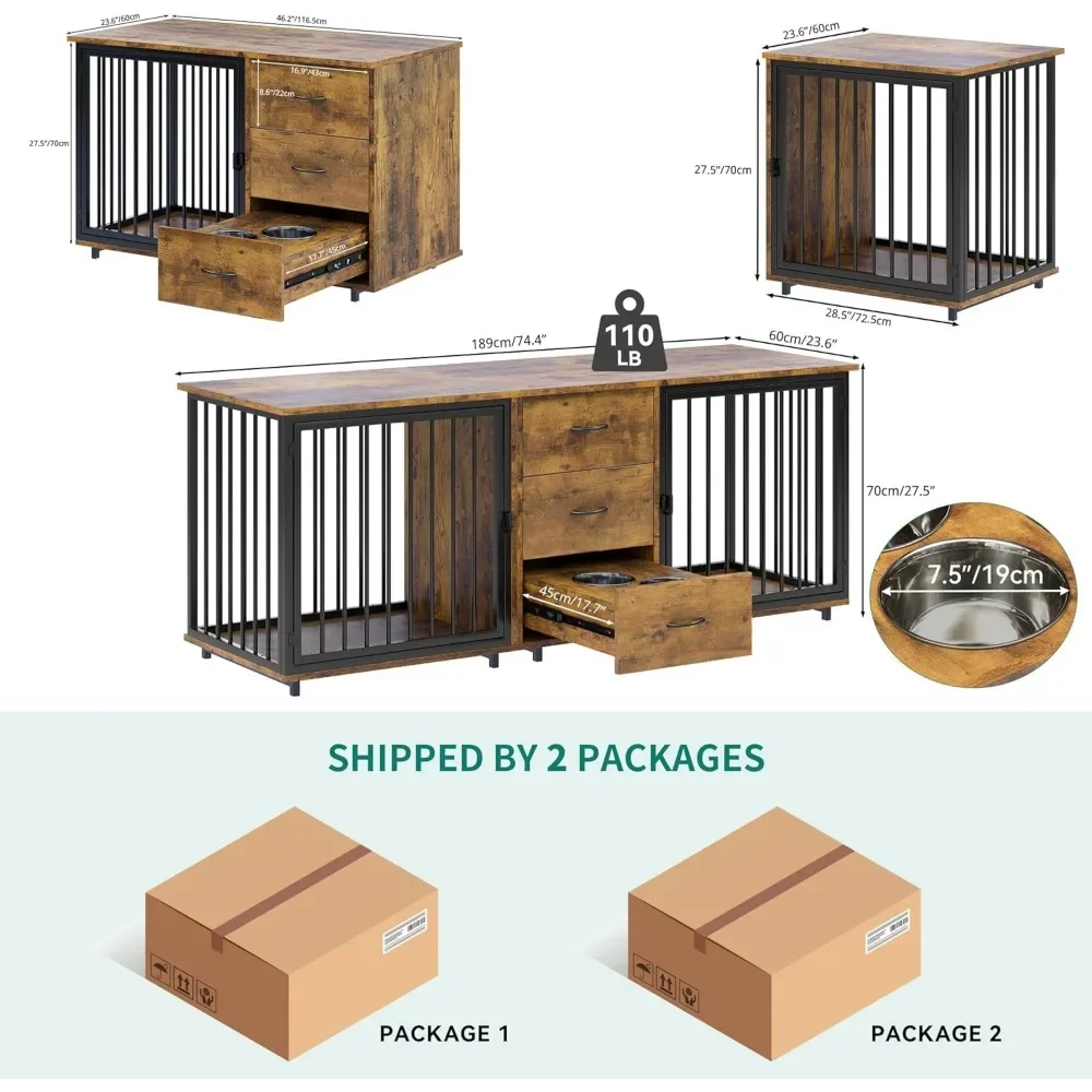74" Dog Crate Furniture with 2 Feeder Bowls
