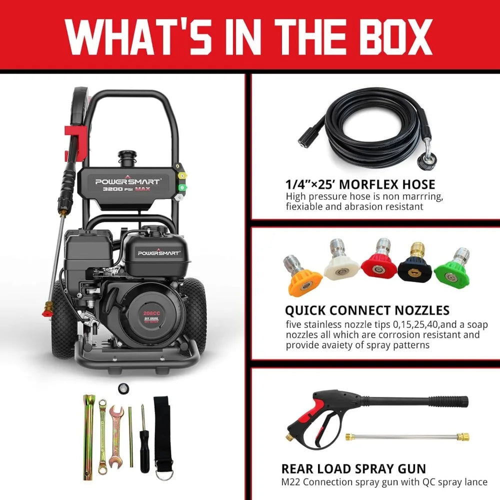208cc Gas Powered Pressure Washer, 3200PSI 2.5 GPM Axial Cam Pump, Onboard Soap Tank, 5 QC Nozzles 5ft Hose, Spray Gun