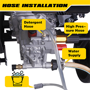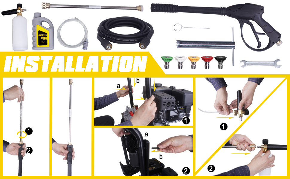 Easy installation in minutes; please make sure all hoses and cleaner connections are correctly and securely fastened before using the gas pressure washer.