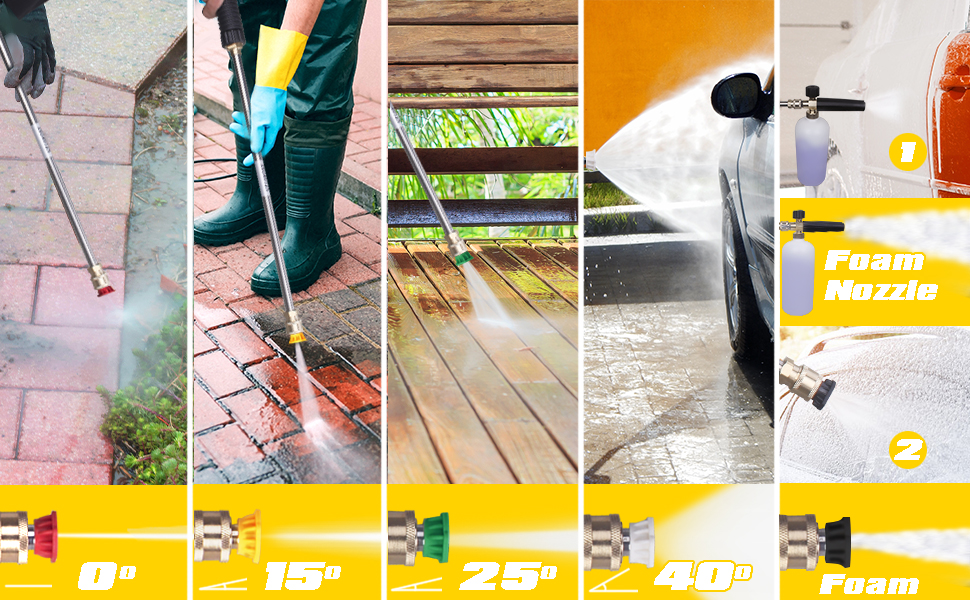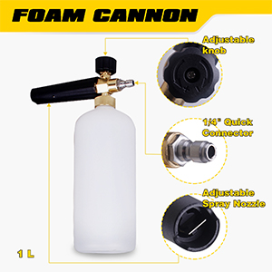 Equipped with 24.5 FT high-pressure hose, threaded connector, 5 quick connect tips (0°, 15°, 25°, 40°, 65°), 1 liter / 0.22 gallon foam cannon , included SAE 10W/30 engine oil.