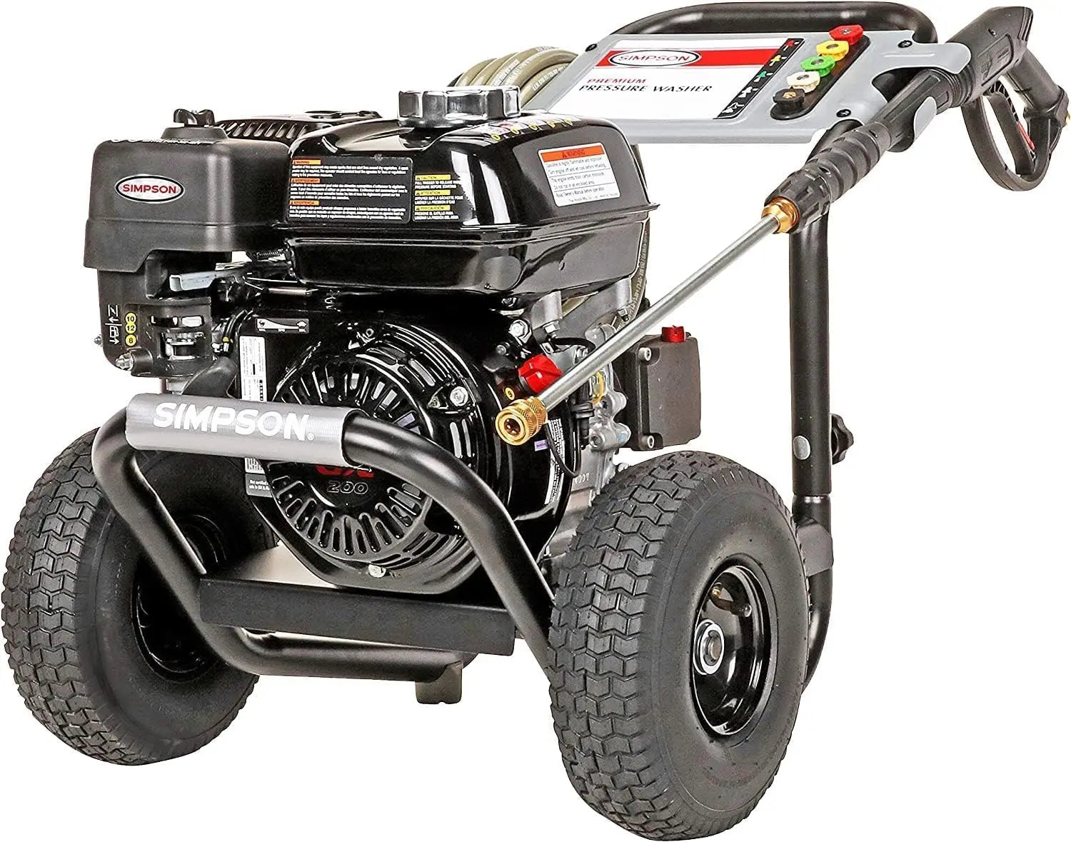 • Includes Quality Simpson Accessories: MorFlex 5/16-inch x 25-foot high-pressure hose is kink- and abrasion-resistant; 5 Quick connect nozzle tips: 0°, 15°, 25°, 40° and Soap; Ergonomic spray gun 16-inch steel wand/lance