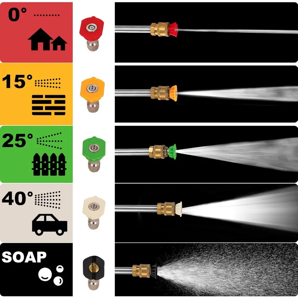- Accessories: 16.9 fl.oz Oil capacity, Trigger handle, Metal spray wand, 1/4" x 27ft flexible hose, 3L Soap Tank, 5 quick connect nozzle tips (0°, 15°, 25°, 40°, soap) for adjustable spray.