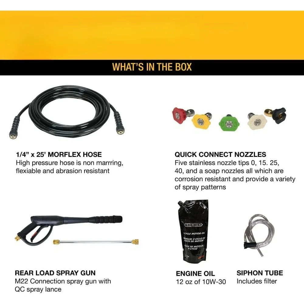 - Includes Quality Accessories; MorFlex ¼-inch x 25-feet high-pressure hose is non-marring, flexible and abrasion-resistant; 5 Quick connect nozzle tips: 0°, 15°, 25°, 40° and Soap for any cleaning tasks; Ergonomic spray gun and 16-inch steel wand/lance