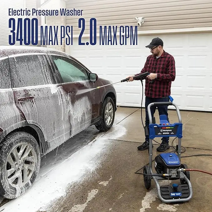 - Max 3400 PSI and Max 2 GPM of Powerful, Deep-Cleaning Water Pressure Perfect for Decks, Sidewalks, Siding, Fences, Railings, Garage Floors, Exterior Walls, Cars and Patio Furniture – Comes with a Half Gallon Onboard Soap Tank