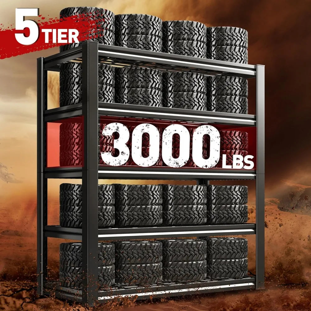 - 【Garage Shelving Heavy Duty Holds 3000LBS 】Unlike flimsy wood panels, storage shelves are made of high quality metal shelves with thickened legs. Each thickened metal shelving comes with extra reinforcements. Made of heavy duty metal, this 5-tier garage storage shelves holds 600 lbs each tier and 3000 lbs in total, perfect for loading heavy items like tires, garage gears, tool boxes and etc. garage shelving will not break or fall apart, with no chemical material used, this shelving unit keeps durable and stable as well. Give you perfect storage experience.